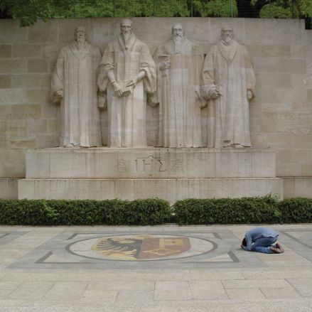 This image shows me lying prostrate in front of the Reformer’s Monument in Geneva. Built in 1909 to commemorate Geneva’s role in the Protestant Reformation, the wall features the four great figures of the movement: Guillaume Farel, one of the first to preach the Reformation in Geneva; John Calvin, the “pope” of the reformers; Théodore de Bèze, first rector of the Academy and John Knox, founder of Presbyterianism in Scotland.